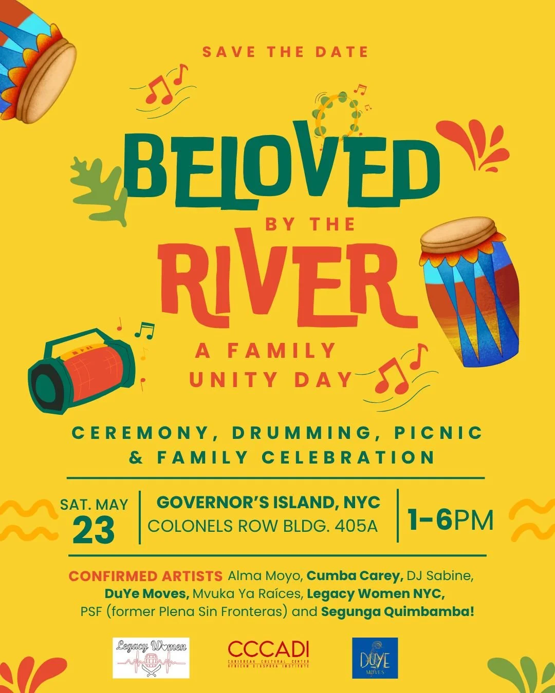 Families, culture bearers, and community members are warmly invited to gather for Beloved by the River, a vibrant afternoon of ceremony, Afro-Caribbean cultural and folkloric music, and family-friendly activities on Saturday, May 23, from 1:00 PM to 6:00 PM at {DuYe Moves on} the historic Governors Island, {at 405A} Colonel’s Row Building.